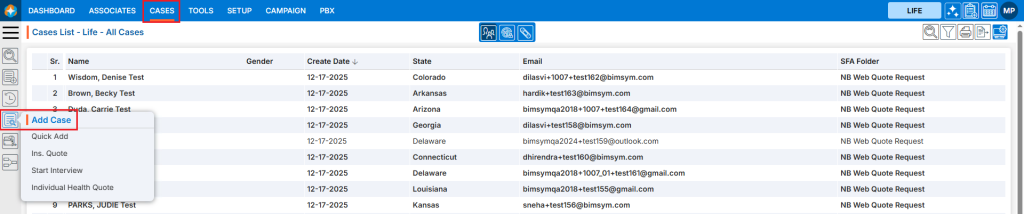 3. In the left-side panel, click Add Case to view all available forms for creating a new case.