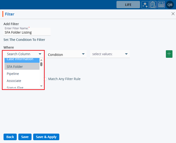 5. Clicking ‘Add Filter’ will open a new window where the user can set the filter criteria according to the requirements.