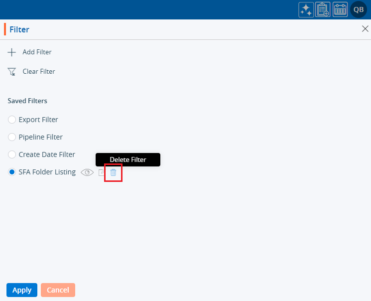 b. Checking the listing: A deleted filter will not be available in the ‘Saved Filters’ section.