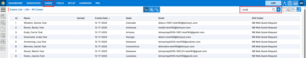 27. Click on the Quick Search and enter the data you want to search for from the Archive List. For example, entering ‘bimsym.com’ will display the cases with the email available with ‘bimsym.com’ domain.