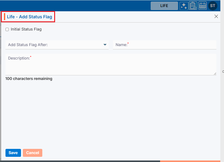 6. A pop-up window titled ‘Life – Add Status Flag’ will open, containing fields for ‘Initial Status Flag,’ ‘Add Status Flag After,’ ‘Status Flag Name,’ and ‘Description’.