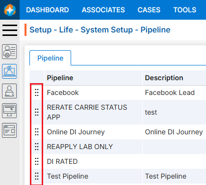 Hover over the Re-arrange () icon at the beginning of a Pipeline.