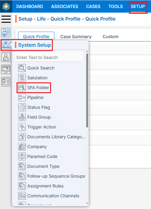 The following are the steps to add/edit/delete Status Flags in the system: 1. Navigate to the ‘SETUP’ tab and click on ‘System Setup’ in the left-side panel.