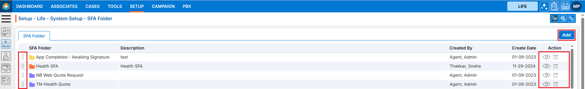 There is an Add button above the Action Column on the right panel to add new SFA Folder
