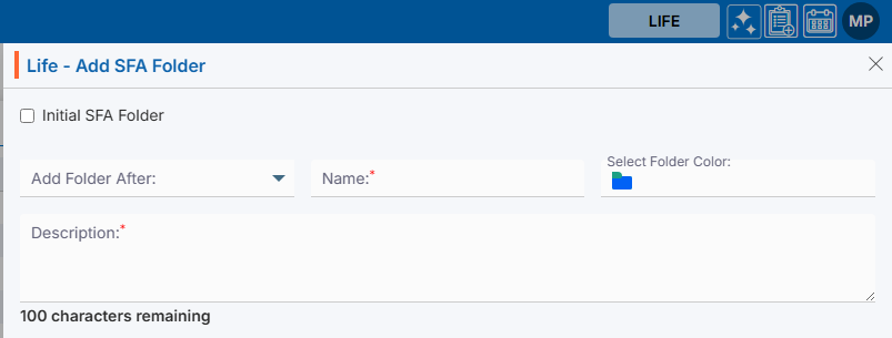 Add Folder After: The user can choose an existing SFA Folder from the drop-down menu, and the new SFA Folder will be added immediately after the selected folder, allowing it to be placed in the desired order