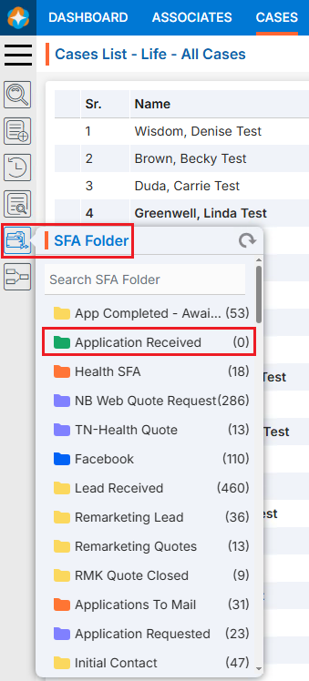 From the left-side panel, click SFA Folder to view the available SFA Folders along with the number cases in each SFA Folder