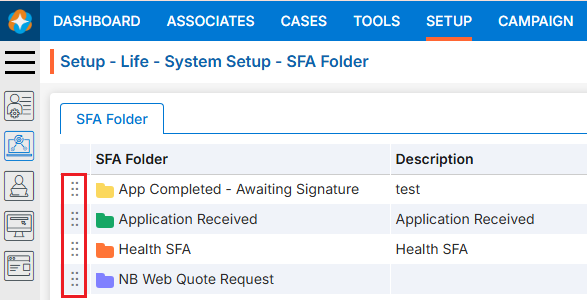 Click and drag the Re-arrange () icon to move up or down the SFA Folder to the desired position, then drop it to save the new order