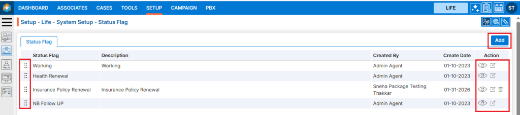 There is an Add button above the Action Column on the right panel to add new Status Flag.