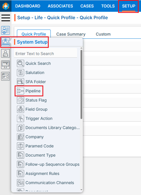 Under System Setup, click Pipeline. Note: The user can also access this page by typing Pipeline in the Enter Text to Search bar.