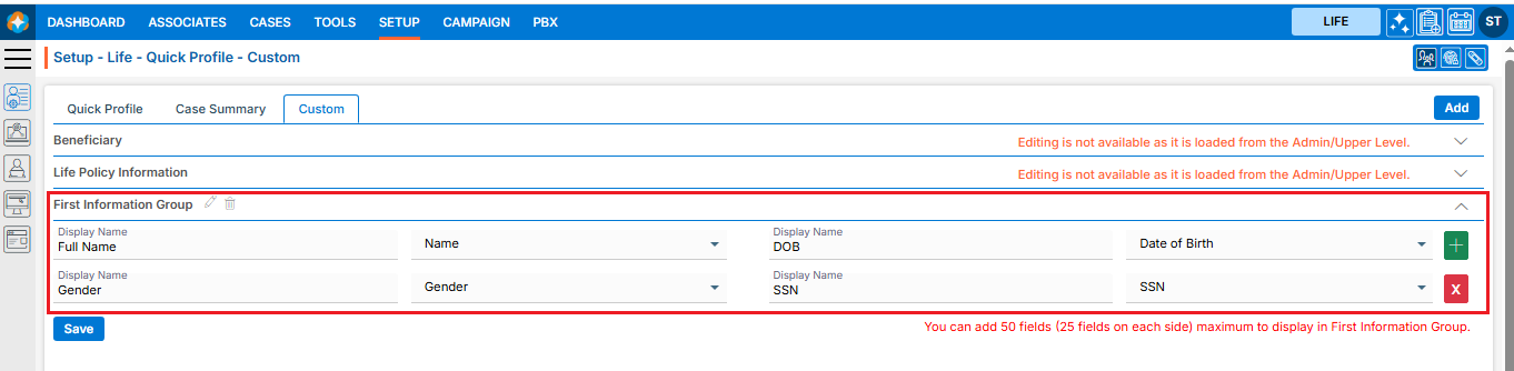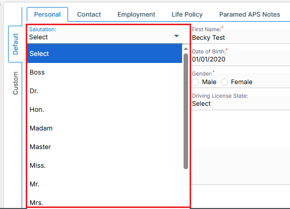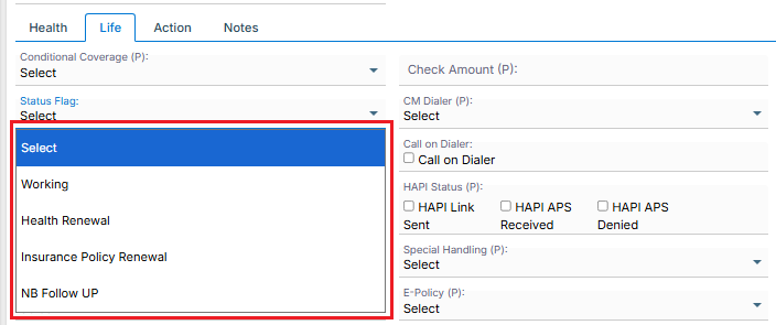 Navigate to the ‘Life’ tab below the ‘Beneficiary’ section to view the drop-down of available Status Flags.