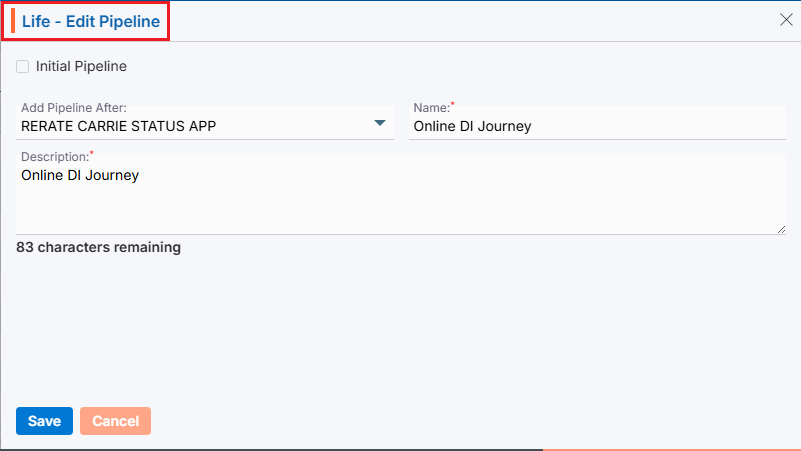 The Add Pipeline window will open, allowing the user to enter the required details to create a new Pipeline.Initial Pipeline: Select this checkbox to keep the Pipeline at the top of the list.Add Pipeline After: The user can choose an existing Pipeline from the drop-down menu, and the new Pipeline will be added immediately after the selected pipeline, allowing it to be placed in the desired order.Name: Enter the clear, descriptive name. This is what users will see under the Cases tab.Description: Optional explanation of the Pipeline’s description.