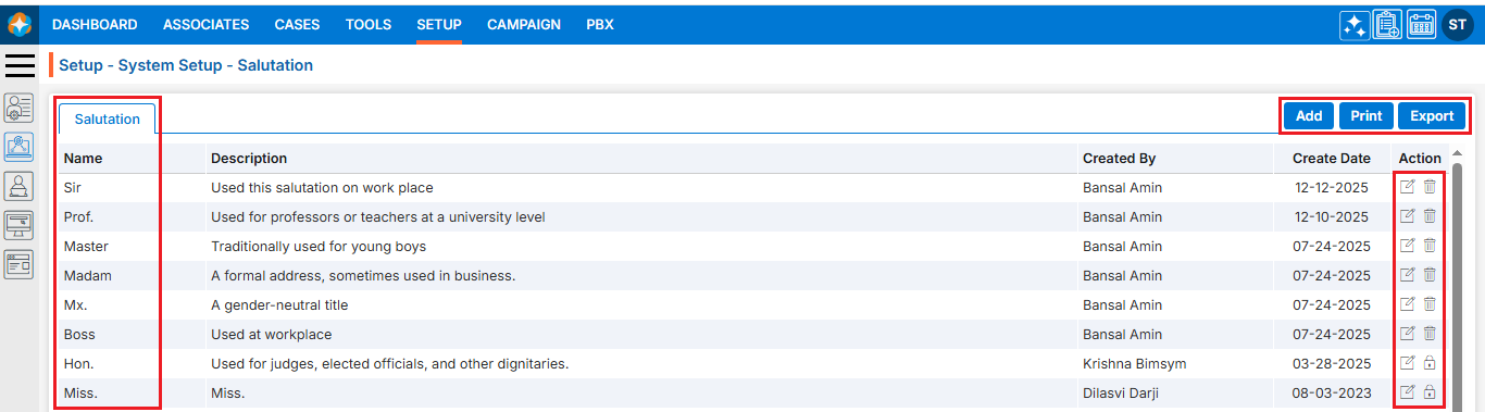 5. The ‘Setup – Life – System Setup – Document Type’ page will open, displaying existing Document Types along with fields including the Document Type, Title, Status, Description, Created By, Create Date and Action under the ‘Document Type’ tab. There are three available options: Add, Print, and Export.