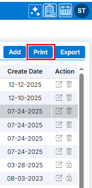 19. After clicking on the Print icon, a page will open with the print window containing the list of available Document Types. The user can print the data using the desired options.