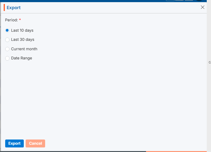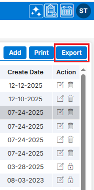 21. By clicking on the Export icon, a pop-up window will open with different options. The user can export the data using the desired options.