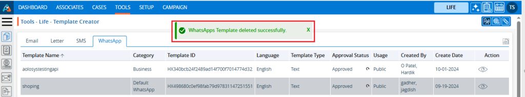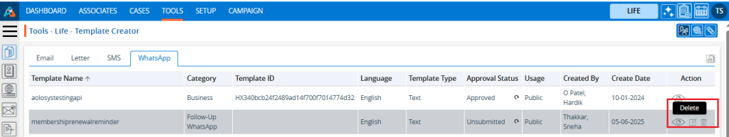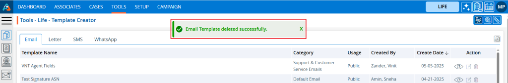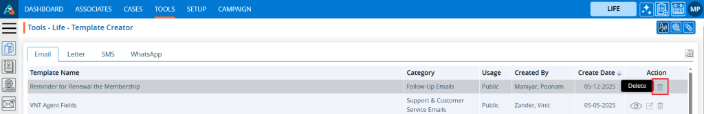 - Important: If the template is referenced elsewhere (for example, in a Trigger), deletion is blocked until those references are removed.