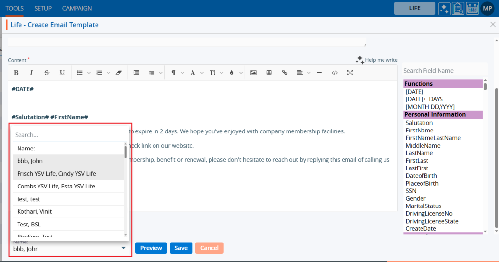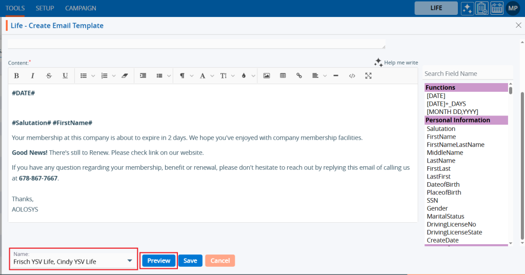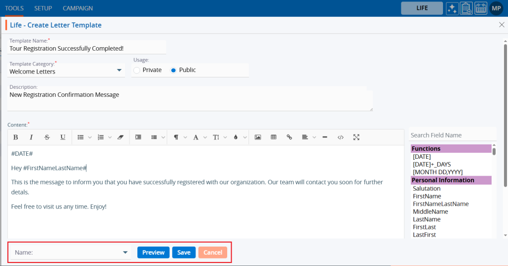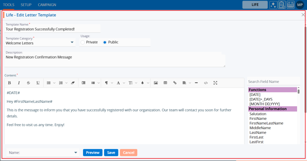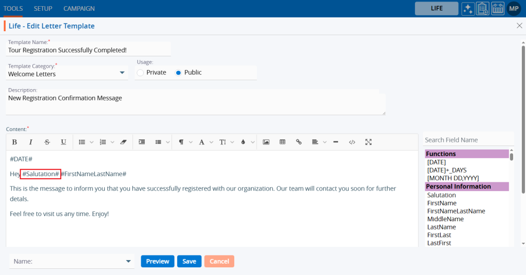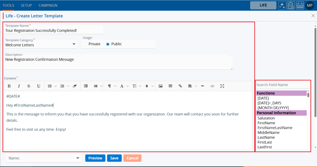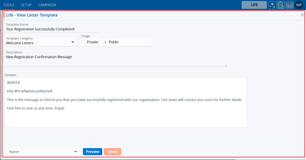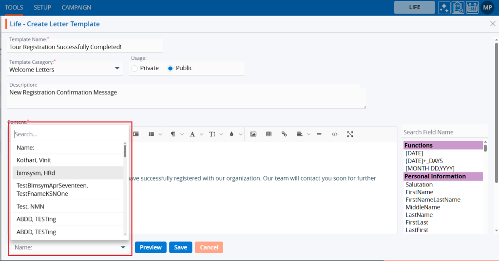 - Preview the letter: choose a sample person, then click Preview to verify that letter format and placeholders resolve correctly.