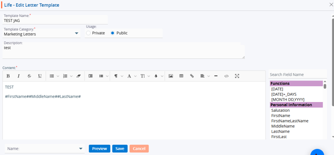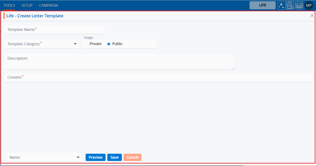 - Template Name: Enter clear, descriptive name. This is what users will see when they select a letter template from other places of the application.