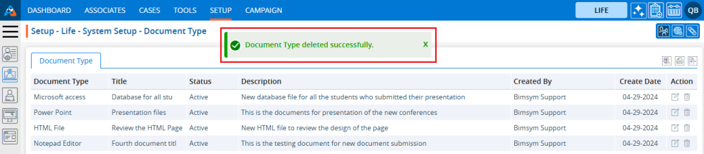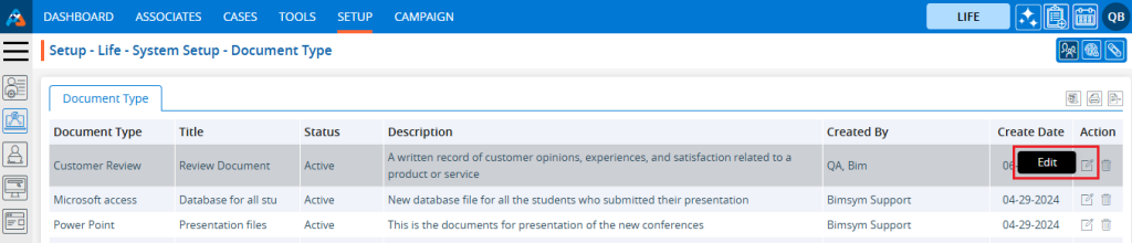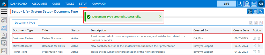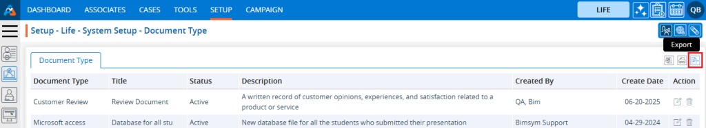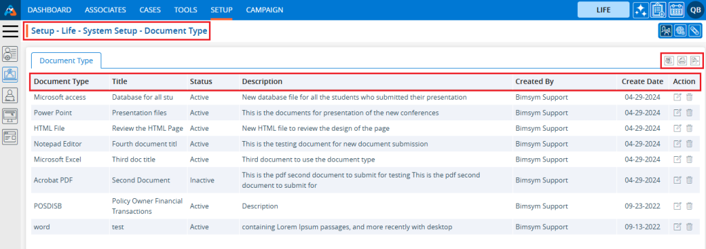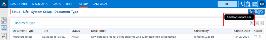 5. The ‘Setup – Life – System Setup – Document Type’ page will open, displaying existing Document Types along with fields including the Document Type, Title, Status, Description, Created By, Create Date and Action under the ‘Document Type’ tab.