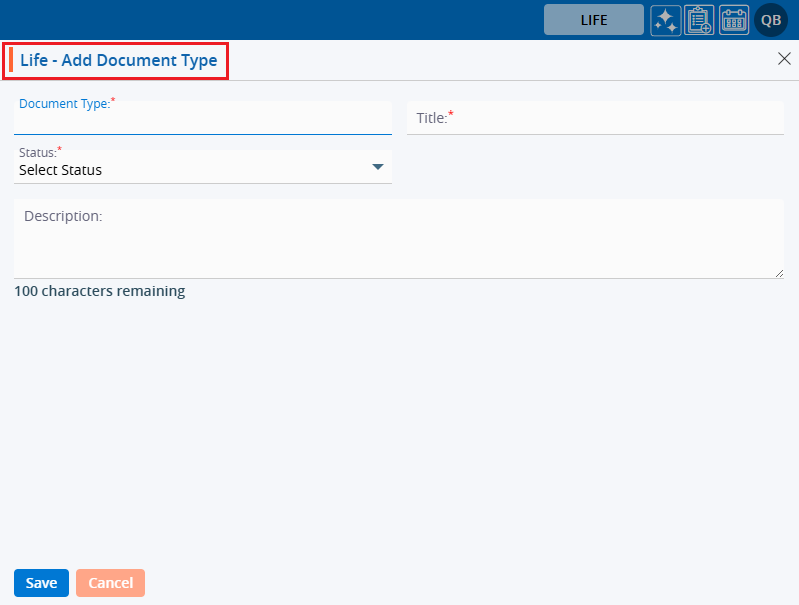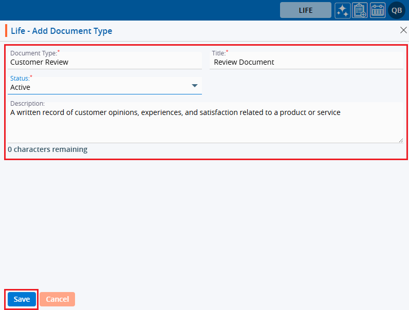 7. The pop-up window ‘Life – Add Document Type’ will open, containing fields for Document Type details and ‘Save’ and ‘Cancel’ options at the bottom. Fields marked with an asterisk are mandatory.