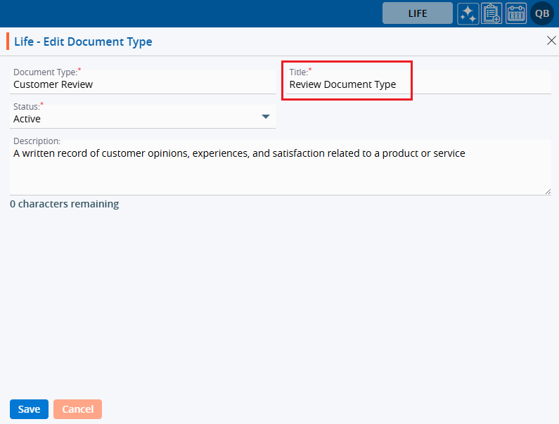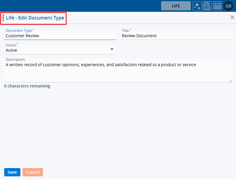 12. A pop-up window titled ‘ Life – Edit Document Type’ will open with the existing field values.