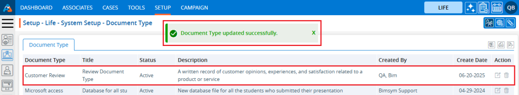 14. The system will generate a confirmation message saying that the ‘Document Type updated Successfully’ and the updated name will be displayed in the listing.