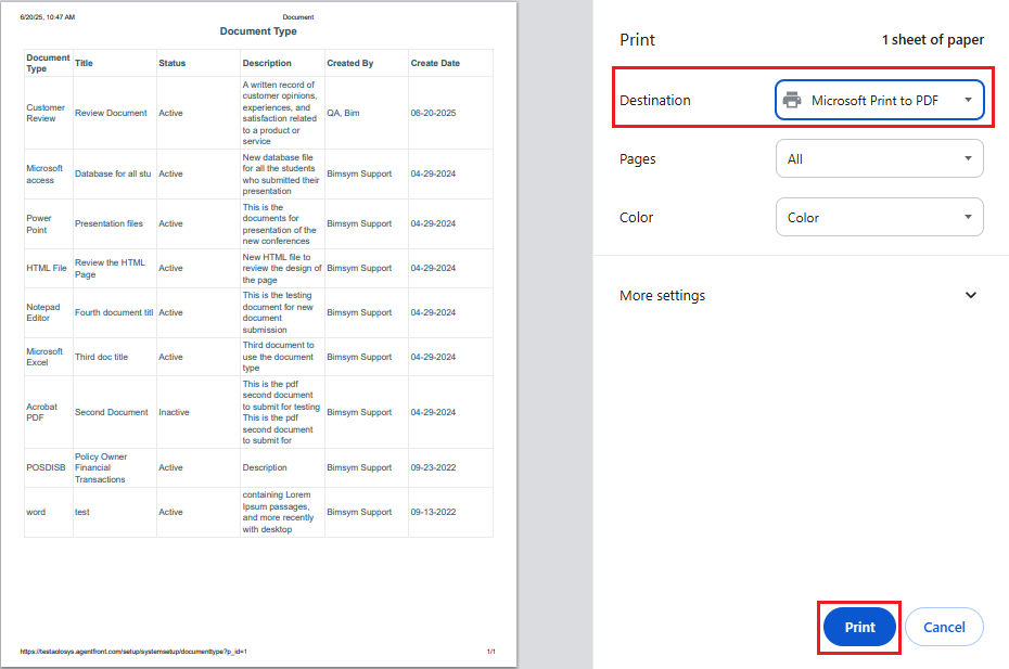 19. After clicking on the Print icon, a page will open with the print window containing the list of available Document Types. The user can print the data using the desired options.