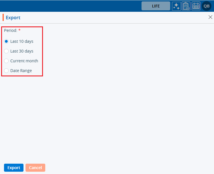21. By clicking on the Export icon, a pop-up window will open with different options. The user can export the data using the desired options.