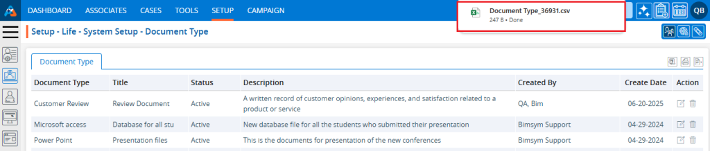 22. The Document Types will be exported according to the selected option, and the CSV file will be saved in the designated location.