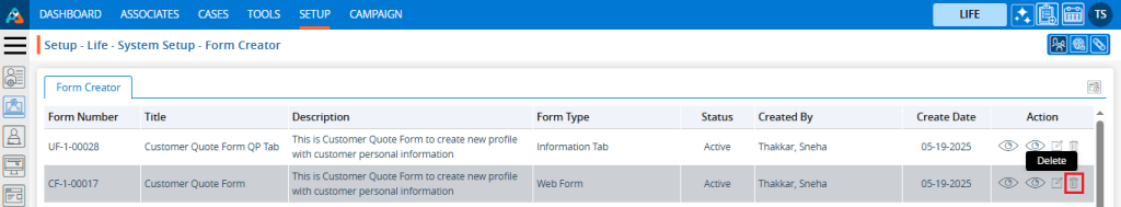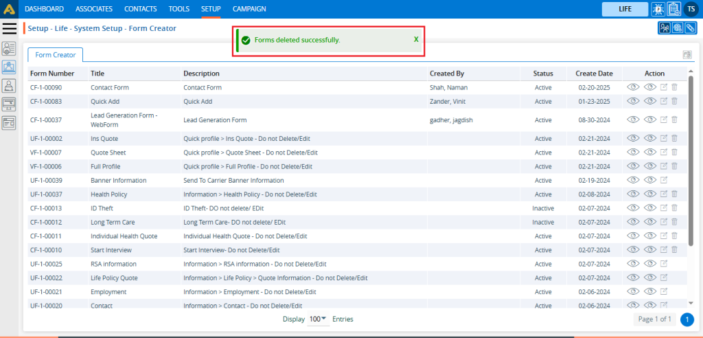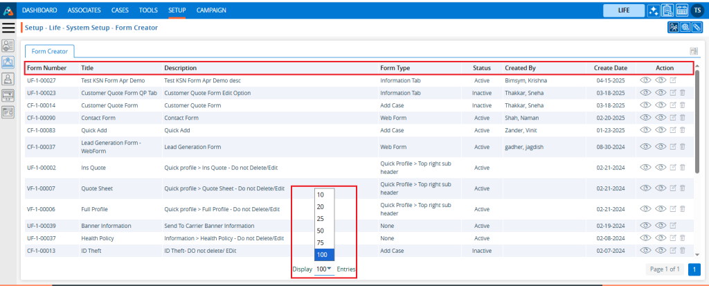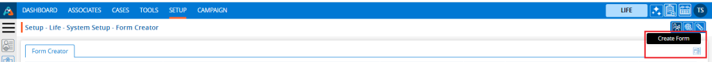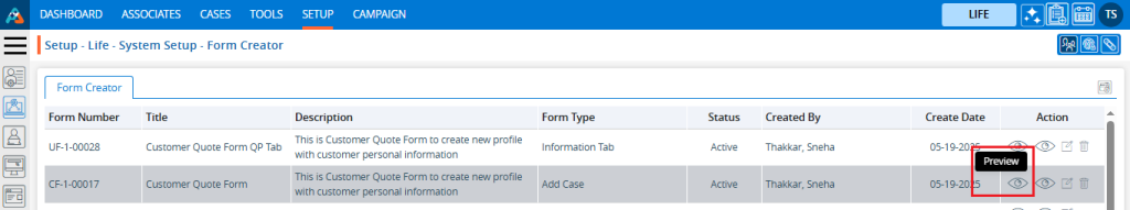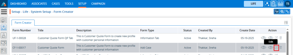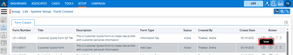4. A new page ‘Setup – Life – System Setup – Form Creator’ displaying the existing Forms with field details including Form Name, Title, Description, Created By, Status, Create Date and Action under the ‘Form Creator’ tab will open.