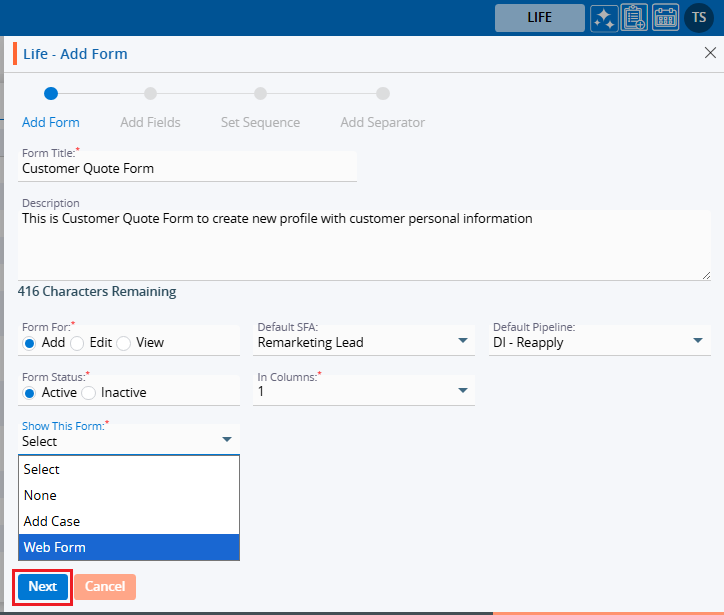 i. If the ‘Add’ option is selected for the field ‘Form For’, the following three options will be enabled in this drop-down: None, Add Case, and Web Form.