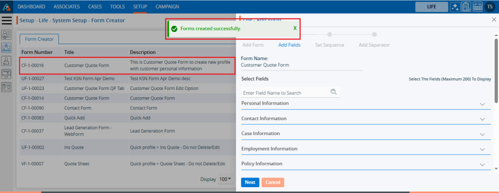 10. After clicking on Next, the system will generate a confirmation message that the form has created successfully. The form will then be available in the listing, and the system will redirect to the next step to add fields to the form.