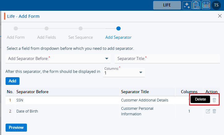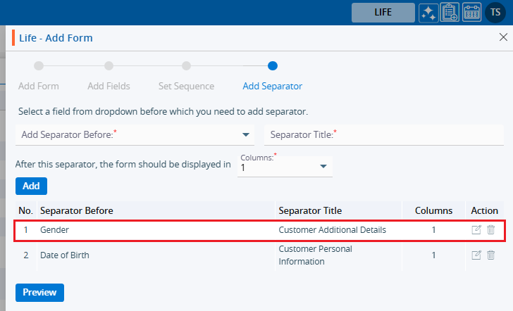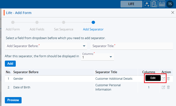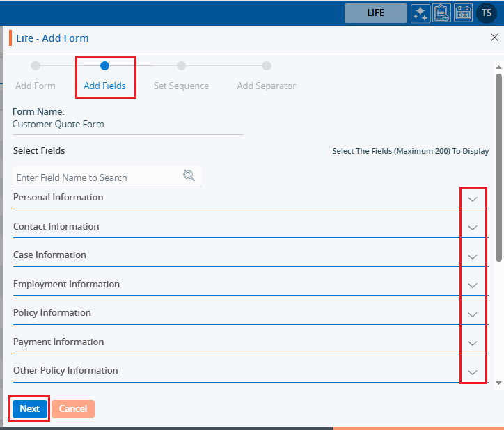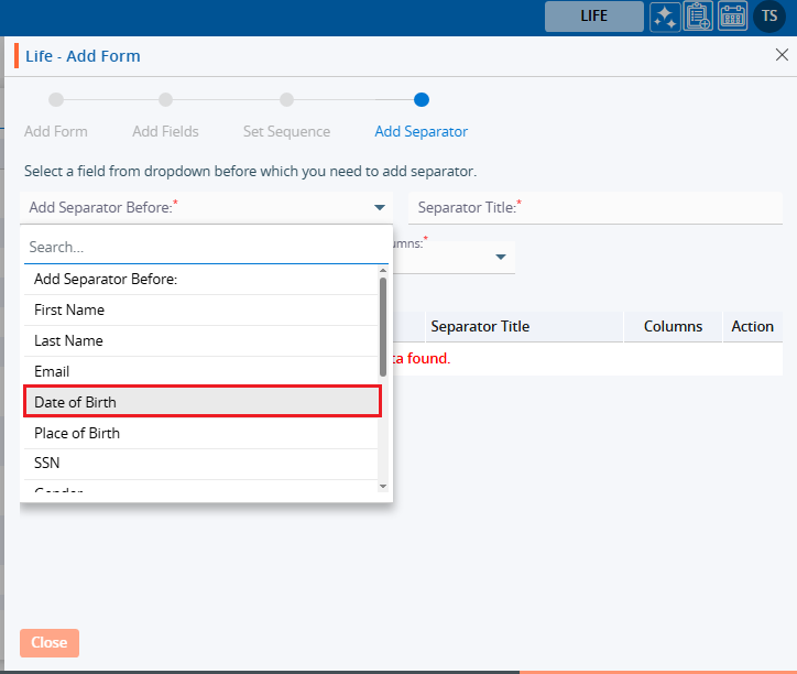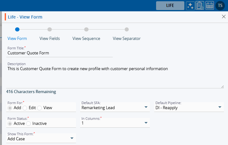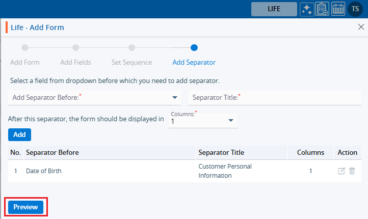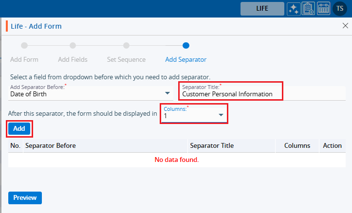 7. A pop-up window ‘Life – Add Form’ will open, containing four steps ‘Add Form’, ’Add Fields’, ‘Set Sequence’, and ‘Add Separator’.