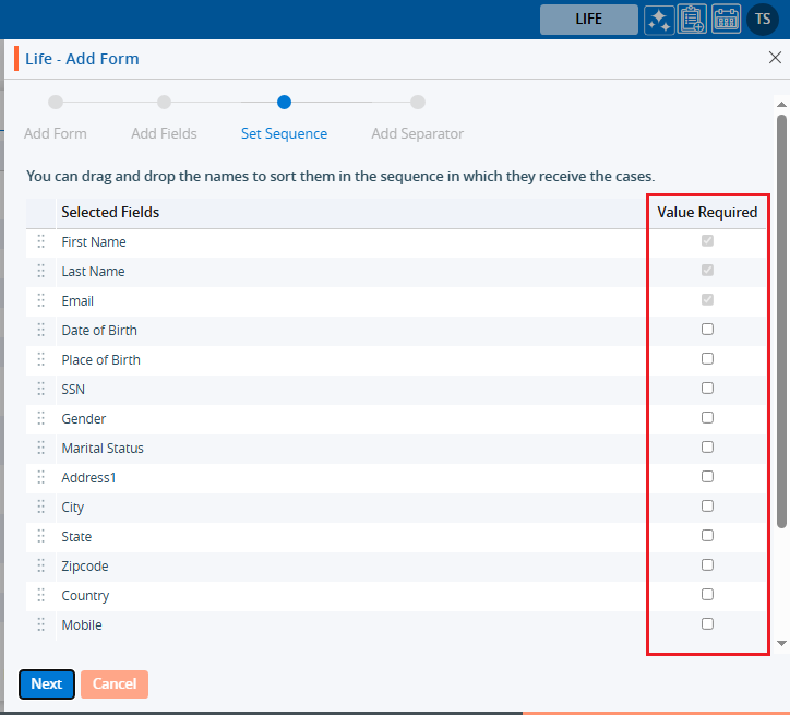 13. The user can set the mandatory fields at this step. By default, First Name, Last Name, and Email are required fields under the ‘Value Required’ section. These three fields cannot be changed to optional; therefore, the checkboxes for these fields are selected by default and are uneditable. The user can add more fields as mandatory from the remaining available fields.
