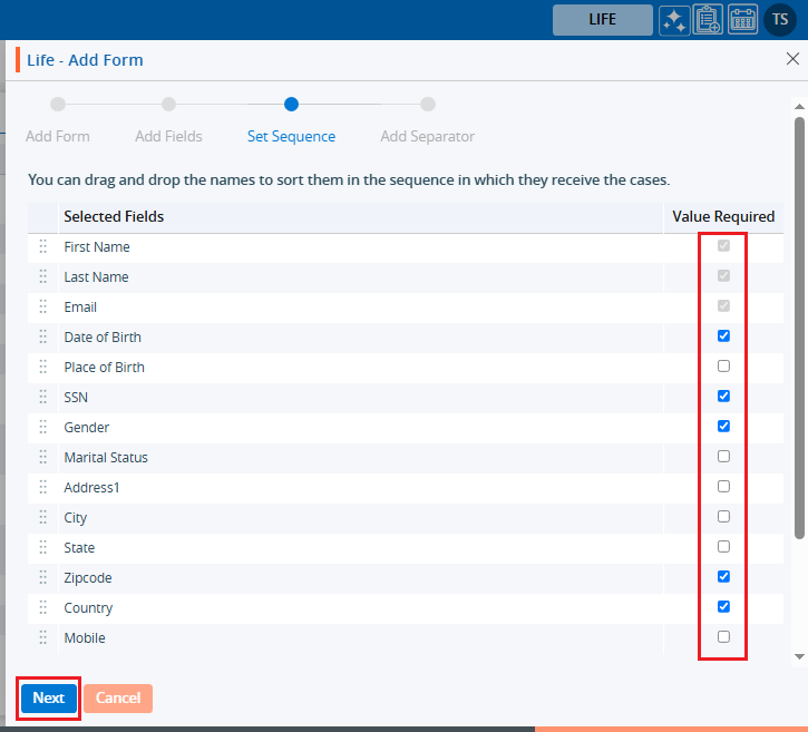 14. After selecting the mandatory fields and arranging the sequence, click on the ‘Next’ button.