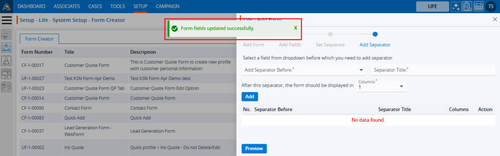 15. After clicking the ‘Next’ button, the system will display a confirmation message stating, ‘Form fields updated successfully,’ and the page will redirect to the next step to add a separator and review the form preview.