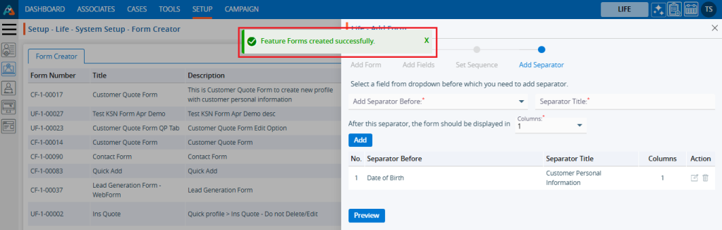 18. After clicking the ‘Add’ button, the system will display a confirmation message stating, ‘Feature Forms created successfully’. The form will then be added to the listing on the same page, with details including Separator Before, Separator Title, Columns, and Action.