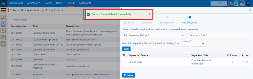25. The system will generate a confirmation message stating that, ‘Feature Forms deleted successfully,’ and the separator will be removed from the list.