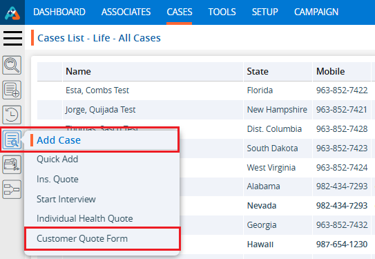 b. With the Add Case option, the form will be available under the CASES > Left side Add Case menu.