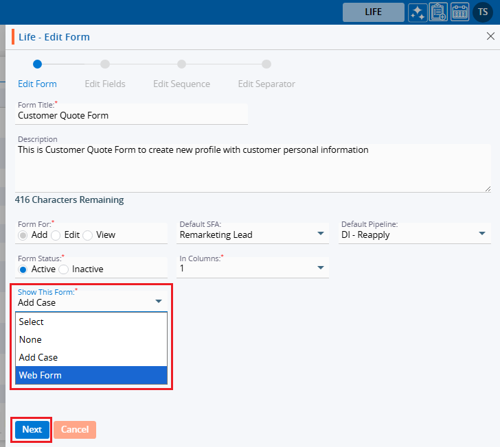 39. Update the value for any field. For example, here we have updated the place for this form by changing the value in the ‘Show this Form’ dropdown from ‘Add Case’ to ‘Web Form’. Then, click the Next button.