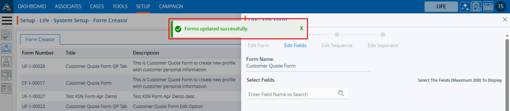 40. After clicking on the Next button, the system will generate a confirmation message stating that the Forms updated successfully, and the page will be redirected to the next step to edit the fields. The user can edit the fields, sequence, and separator as required and apply the necessary changes. Here, we have only changed the place for this form.