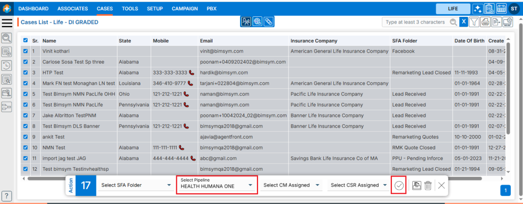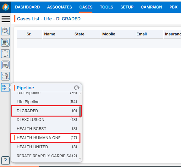 - User can see the number of cases will be updated in Pipeline on cases tab. We have moved cases from the ‘DI GRADED’ pipeline to the ‘HEALTH HUMANA ONE’ pipeline. As a result, 17 cases were transferred to ‘HEALTH HUMANA ONE’, updating its count from 0 to 17, while the count for the ‘DI GRADED’ pipeline are updated from 17 to 0.