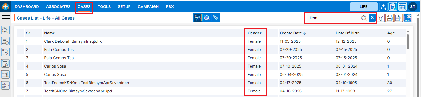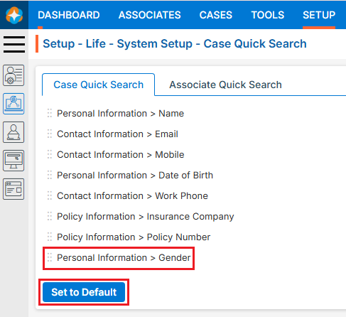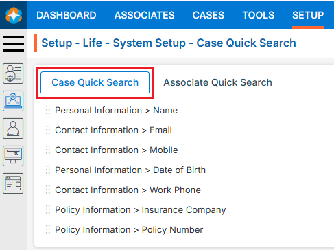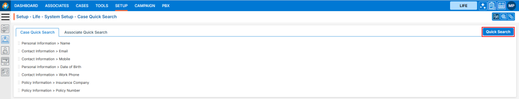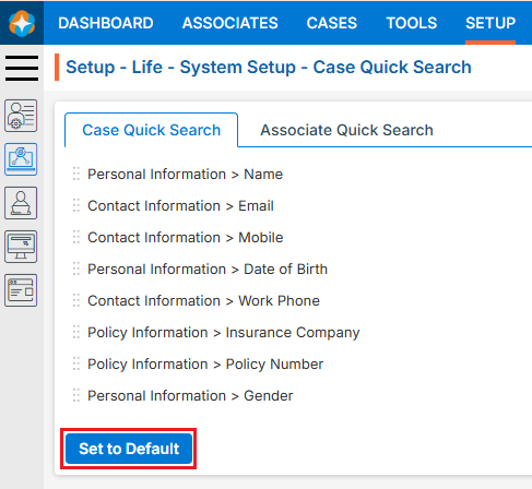 - Once the Cases Quick Search settings are reset, the search will operate using the default field preferences defined in System Setup