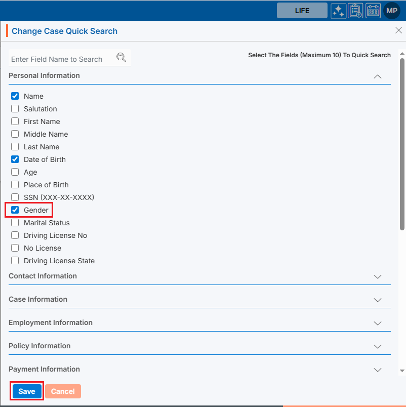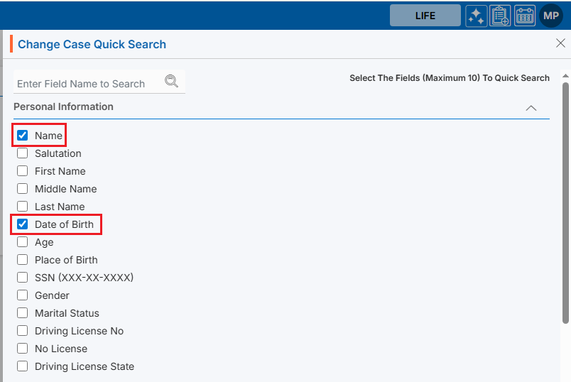- Select or deselect fields to configure which Personal Information fields are included in Cases Quick Search